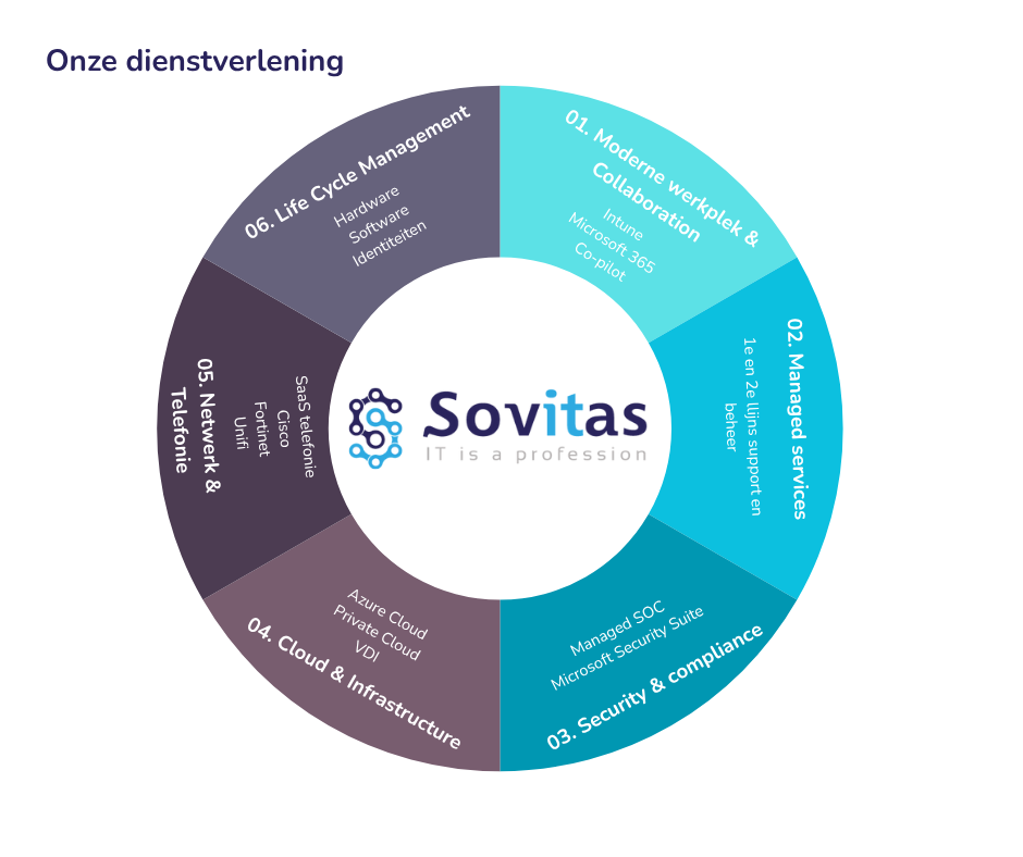 Sovitas is een Nederlandse ICT-dienstverlener die organisaties helpt hun IT-omgeving toekomstbestendig, veilig en efficiënt in te richten. Wij combineren technische expertise met een persoonlijke en pragmatische aanpak, waardoor wij in staat zijn om nauw aan te sluiten bij de behoeften en doelstellingen van onze klanten.
